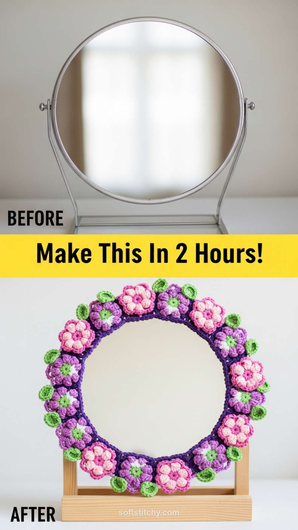 A: Measure the circumference of your mirror (C = πd). Crochet one test flower and measure its width. Divide the circumference by the flower width, then add 1 or 2 extra flowers to ensure a tight, seamless fit.